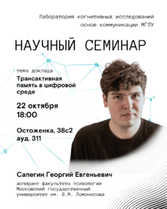 На семинаре будет рассмотрен ключевой вопрос: стоит ли сохранять информацию самому, если её знает другой — человек или система? Современные исследования показывают, что память может существовать в распределённой форме, напоминая социальную сеть, складывающуюся в процессе совместной деятельности. Такая система получила название трансактивная память.